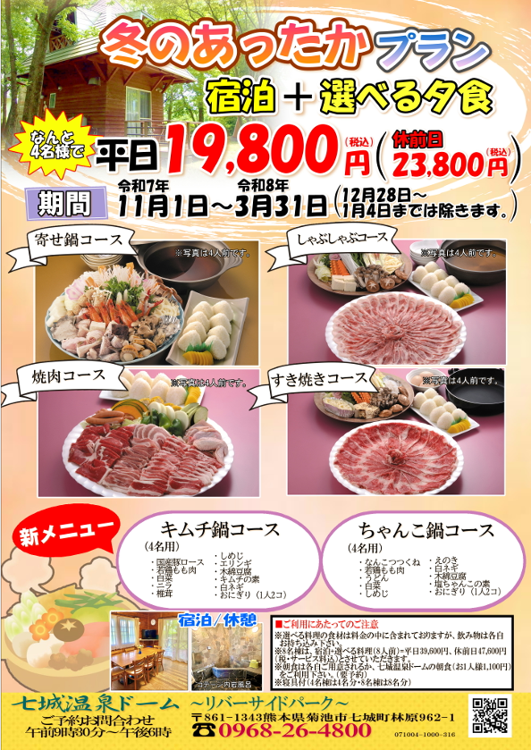 【合宿パック】 大人(高校生以上)1泊2食付き8,000円 小人(中学生以下)1泊2食付き7,300円 |
